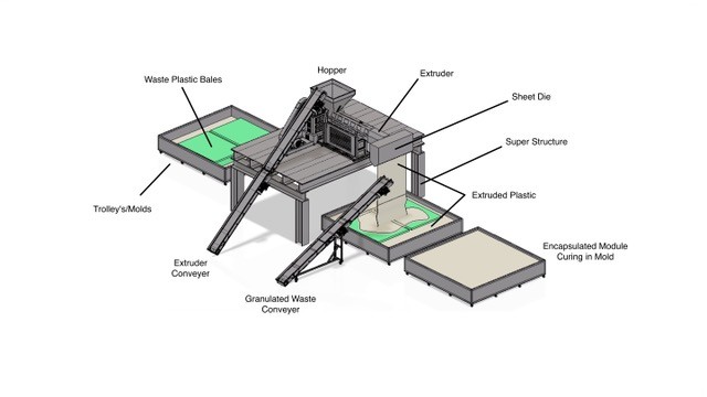 MGM Modules Ltd is the R + D operation pioneering the methods and processing plant to convert waste plastics, tires and many other varieties of waste into solid masses we call plubber modules. The patented process of compressing mixed waste and tires using steel reinforcing then remelting mixed sources of plastic waste to encapsulate the solidified waste produces slabs, blocks, bricks and other forms as a substitute or supplement for concrete and other building materials.