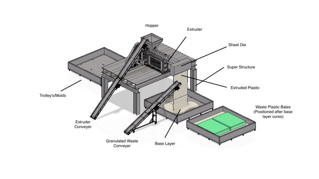 The initial plan is to produce various sizes of slabs and blocks made from clean sources of excess production waste such as LDPE, Nylon and Polypropylene so suitable for a wide variety of applications. The future evolution and testing of products to focus on the problem of mixed soft plastics and the developments to include scrap rubber and solidify whole tires will benefit from establishing the processing and plant equipment.